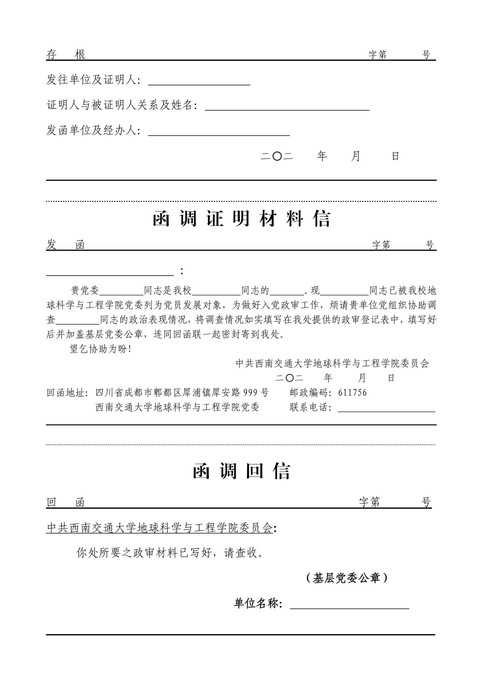 4.完整的函调寄回时需包括,函调回信(函调证明材料信第三联)以及政审登记表(调查材料上需加盖党委章)。