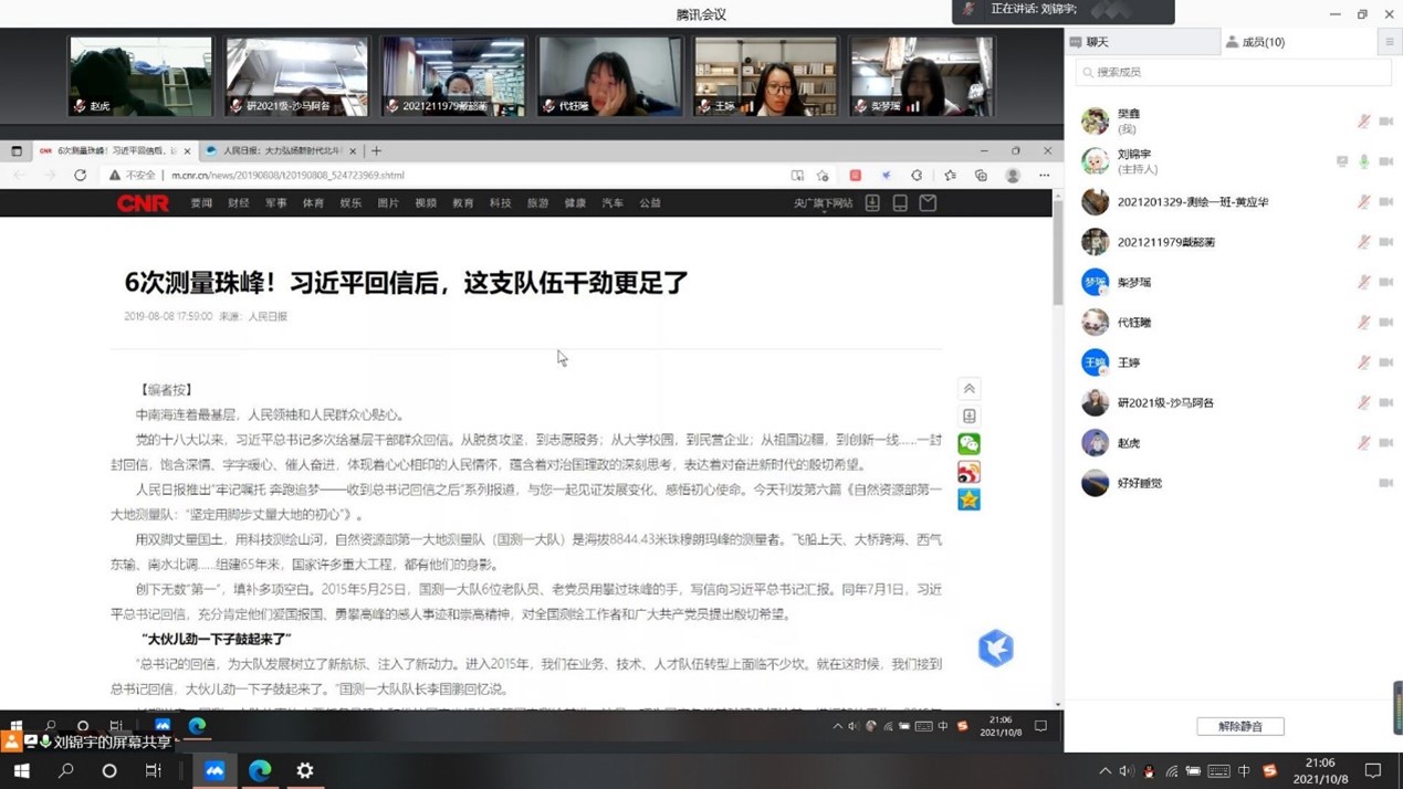 首先,队长刘锦宇同学带领大家集体学习了党的百年峥嵘历史。习近平总书记指出:“中国有了中国共产党执政,是中国、中国人民、中华民族的一大幸事。”没有中国共产党就没有新中国,就没有中国特色社会主义,就没有中华民族伟大复兴。中国共产党成功的密码是什么?为什么只有中国共产党才能领导人民创造人间奇迹?在中国共产党百年华诞之时,深刻感悟中国共产党为什么“能”的内在逻辑,对于在新的历史起点上开启第二个百年奋斗目标和坚定道路自信,具有十分重要的意义。刘锦宇同学通过引用习近平总书记的讲话,向团队同学阐述了党史学习的重大意义。
