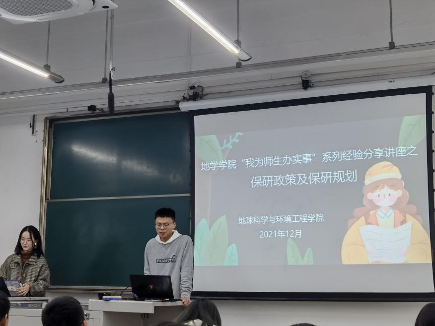 学习与科创中心分别邀请2018级环境工程专业崔耀丹(推免至南京大学)分享保研经验,2019级地质工程专业排名第一、国家A类竞赛获得者叶志虎分享科创经验。