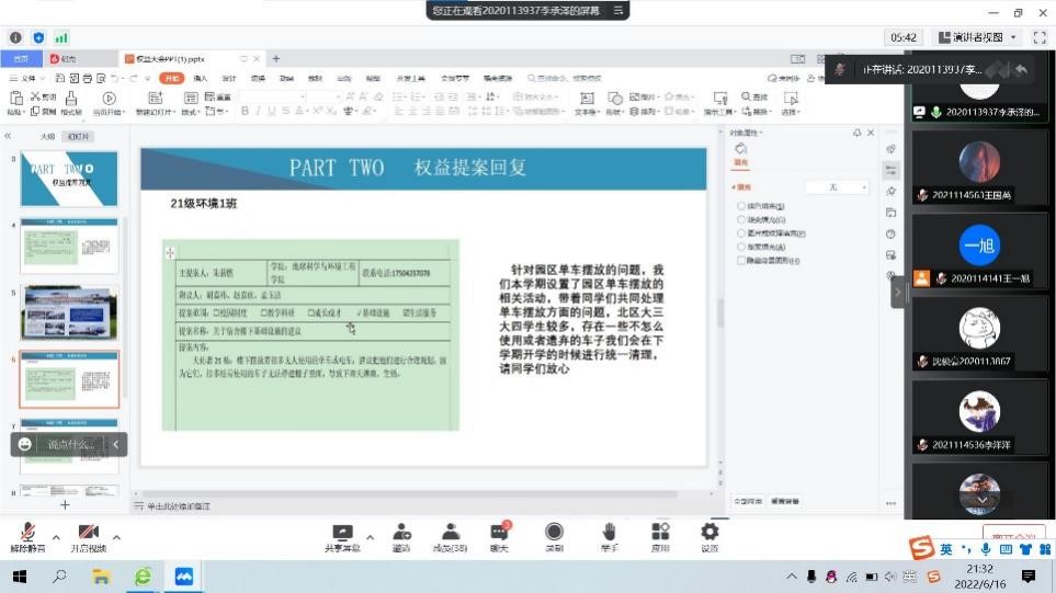 紧接着,学生会权益服务部部长杨伊涛对收集的部分权益提案进行了解答和回复,给出了将先前调研收集到的结果向学校领导汇报反映后得到的反馈,针对问题给出了解决措施。