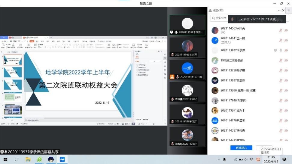 学生会2022年上半年第二次权益大会在线上腾讯会议顺利举行。本次参会人员为学生会主席陈荩娜、学生会权益服务部全体工作人员、学生园区与事务中心生活部工作人员、全体权益与生活委员。会议由学生园区与事务中心生活部部长李承泽主持。