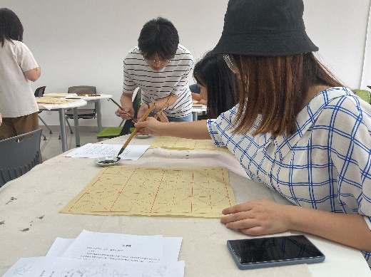 其次,大学生书画协会九里分会的同学对书画协会进行了简单的介绍,并带领大家一起学习毛笔字书法的相关知识,包括握笔姿势、笔划书写方式等。在同学们正式开始写作前,书画协会的同学线给大家进行现场教学,演示了如何正确握笔,并示范如何用毛笔写出规整的笔划。