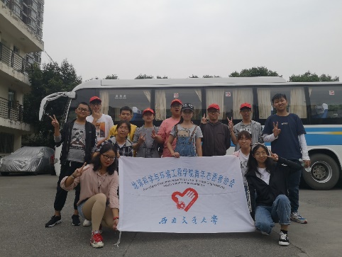 清洗完校车,志愿者于校车前合影纪念,踏着夕阳,回到了犀浦校区。