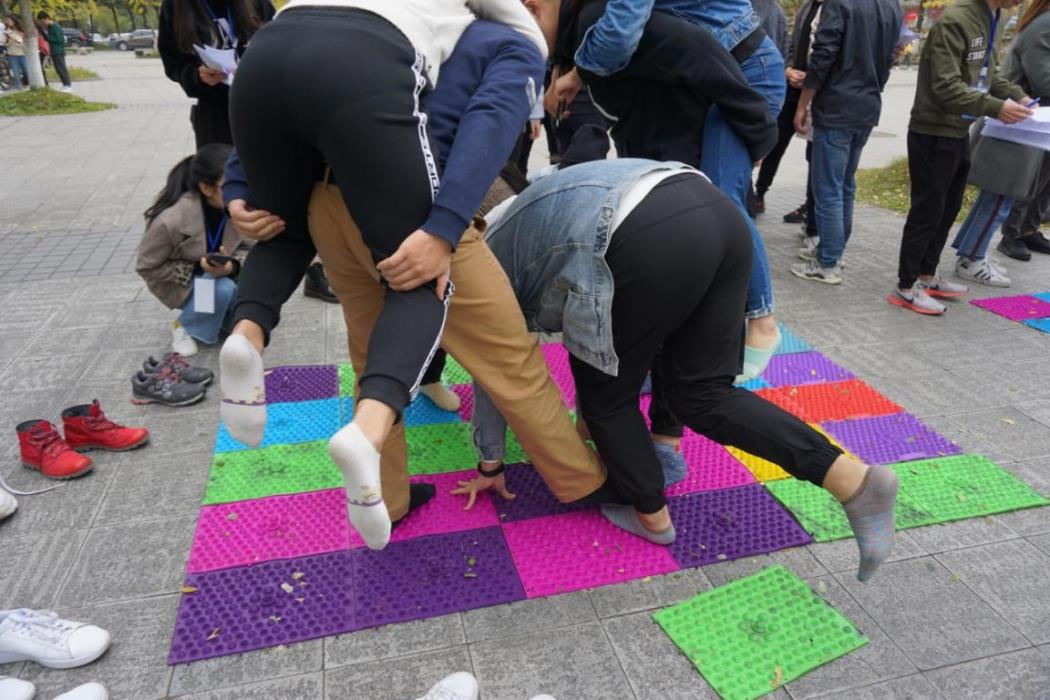 活动的第七个环节,游戏名称是“七手八脚”,也是最受期待的项目。此游戏需在指压板上完成,每2个队同时进行,由主持人给出指定肢体数量,全队员合作完成该动作,并坚持5秒。出乎意料的是,在经过前6个游戏的磨炼后,所有队伍均配合默契,以非常短的时间完成了游戏,悄悄告诉大家,这个游戏我们工作人员完成了很久都没完成呢!