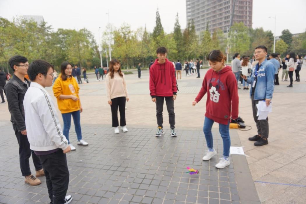 活动的第四个环节,游戏名称是“一击即中”,每组距离圈4米,每组成员依次将毽子置于鞋上,往圈里踢,踢完捡毽子交给下一个人。大家的默契程度进一步得到了增加。