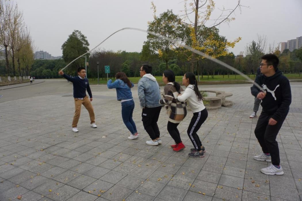 活动的第六个环节,游戏名称是“我摇你跳”。每队2个人摇长绳,另外4人开始游戏,跳满30个,游戏即算完成。团队间的默契程度进一步提升,比赛中一支队伍因一位成员频频出错,没能在理想的时间内完成任务,但是他们没有抱怨,而是相互鼓励、更加团结,通过这个比赛参与者更好的明白了包容和理解的含义。