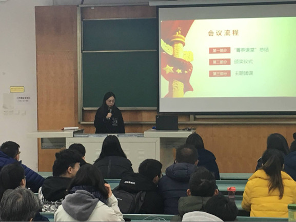 在12月13日进行了结课仪式,本次结业仪式由学生会团建部部长韩奕菲主持。首先由院副团委书记赵瑞涵对“菁英课堂”进行总结。随后团建部的人员根据参与课程的积极度及考试成绩,评选出了9个优秀个人奖和3个优秀集体奖,让到场嘉宾对优秀同学和集体进行颁奖。颁奖结束之后,院团委书记周青老师主持主题团课,老师详细地介绍了菁英课堂的主要目的——培养班团干部所需技能。“菁英课堂”还想要传达的理念是:班团干部要坚持学习,不断提高思想素质。思想政治素质是由世界观、人生观和价值观决定的,具有鲜明的阶级性。身为班团干部,应当树立远大理想,高举旗帜,坚定信念,带领班级成员完成一个又一个的使命。