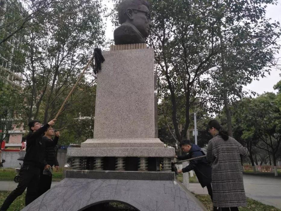 为了让学校雕塑得到清洁和维护,为了让校园环境空间变得舒适干净,3月14日,我们的志愿者们展开了一月一度的对二教后面的刘恢先生雕像的清洗工作。