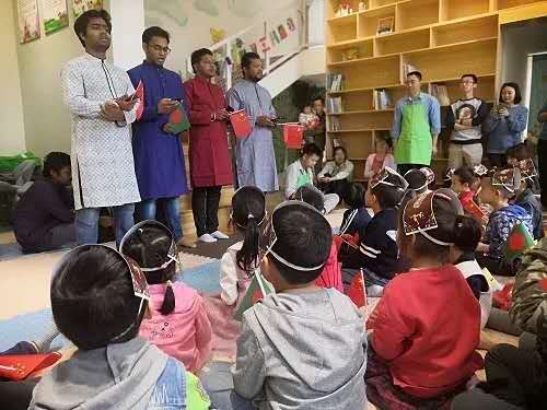 10点小朋友们进入故事小屋现场,活动开始。接下来是半个小时的自由阅读时间,小朋友们开展自由阅读。10:30家长扫码签到,凭借签到码领取孟加拉国礼物。10:35开始讲故事。大海哥哥讲龙的故乡的绘本故事。小朋友们听的聚精会神,完全融入了故事的情节起伏当中。10:45孟加拉国留学生唱孟加拉国新年祝福歌曲,歌曲别有一番异域风情,小朋友们被带动了起来。11点小朋友们开始吃孟加拉国糕点,可能是第一次尝到孟加拉国的糕点,小朋友们都充满了好奇。