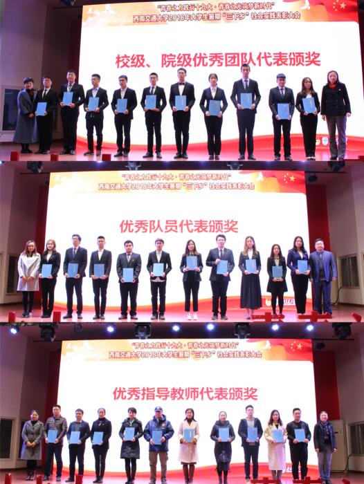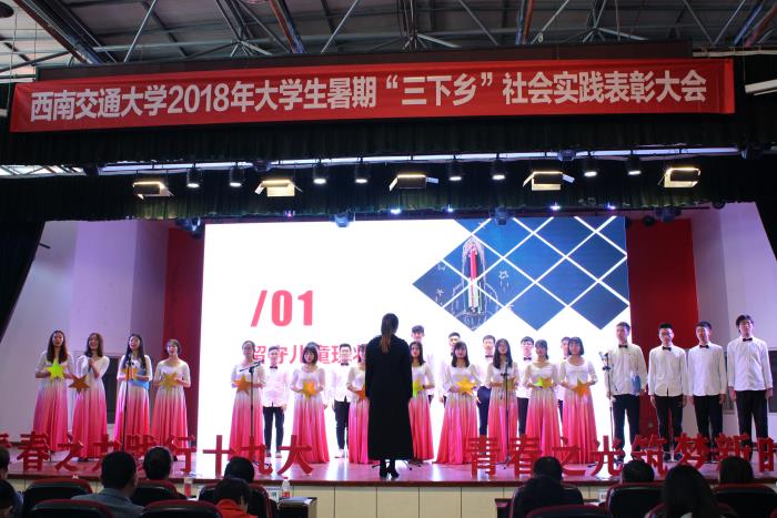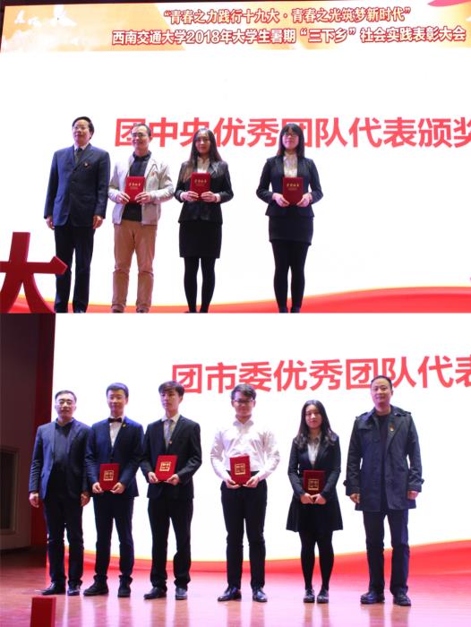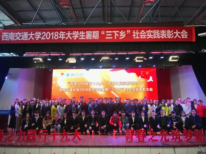 2018年暑期,学校以“青春之力践行十九大·青春之光筑梦新时代”为主题开展了“三下乡”社会实践活动,全校350支队伍、131名教师、近3000名同学主动参与,师生足迹覆盖全国27个省、自治区、直辖市和美国、英国、新加坡等国家。活动中,广大师生秉承“竢实扬华,自强不息”的交大精神,不畏酷暑,不怕劳累,在改革开放40年取得的新成就、新面貌的生动实践中受教育、长才干、做贡献。学校团委连续三年获得团中央暑期“三下乡”社会实践“优秀单位”荣誉称号,机关党委赴彭州市社会实践队等3支队伍获得团中央“优秀团队”表彰,建筑与设计学院“聚焦‘一带一路’,品味建筑之美”社会实践队等4支队伍获得团市委“优秀团队”表彰,苏小桦老师等4名教师获得团市委“优秀指导教师”称号。