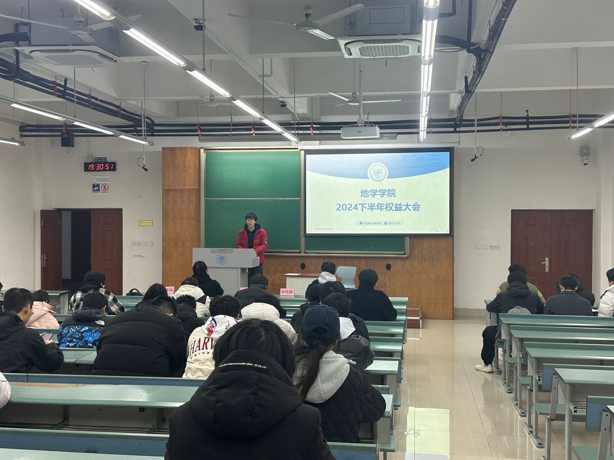 学生园区与事务中心于2024年12月12日,在X4157教室成功举办了2024-2025学年第一次权益大会。此次会议由学生园区与事务中心副部长应圣铭主持,学生园区与事务中心指导老师姜茜、主席团及部长,以及生活与权益委员参与会议。