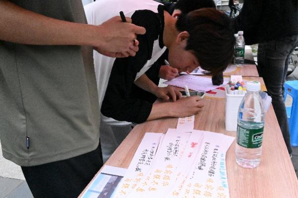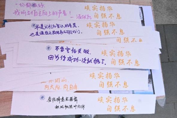书腰,宛如书籍的轻盈丝绸腰带,在墨香世界里翩跹起舞,为阅读体验添上灵动一笔。它不仅是书籍装帧的点睛之笔,以绚丽的色彩、独特的排版设计为书籍披上华丽外衣,更是文化与艺术的小小载体,承载着书籍的灵魂。在活动现场,同学们参考样例进行创作,发挥自己的想象,用不同色彩的马克笔在特制的空白书腰上写上自己喜欢的句子留作纪念。