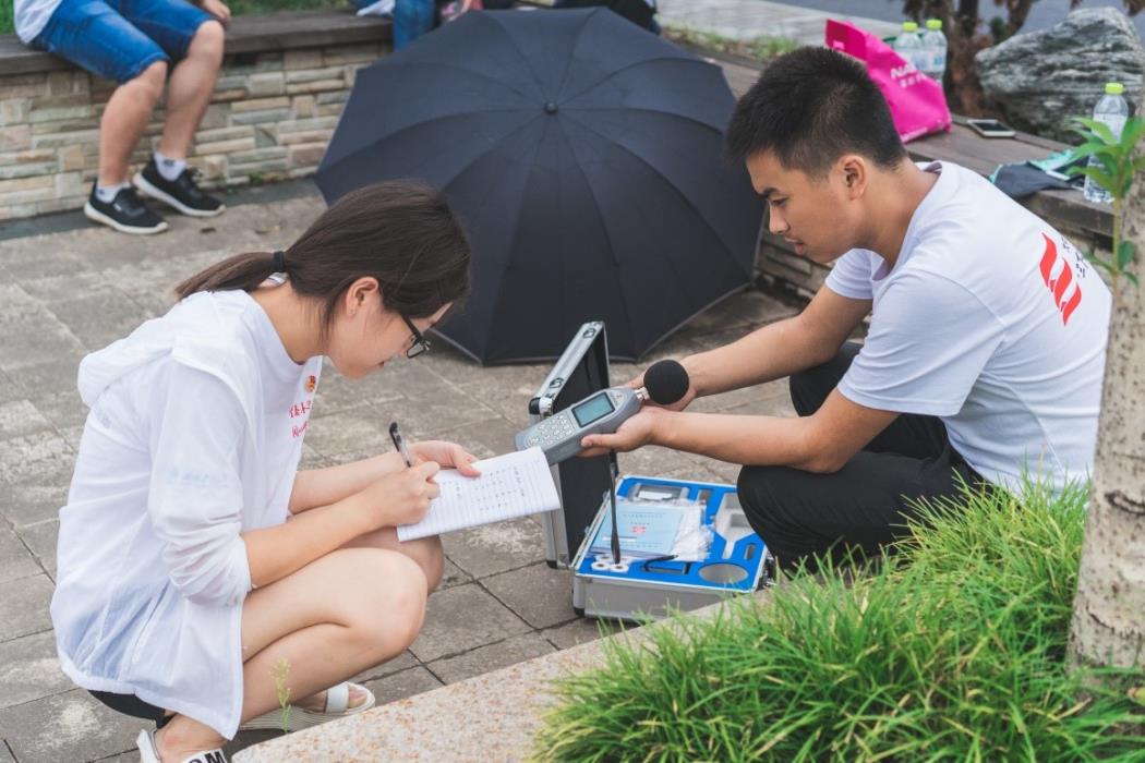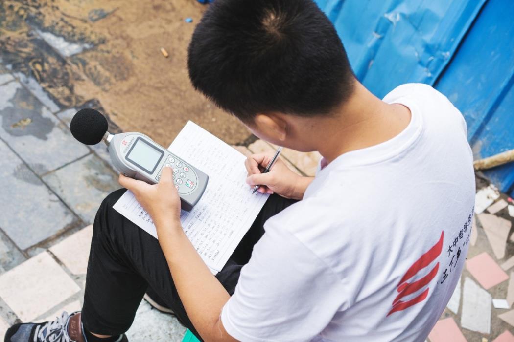 8月21日,队员们来到了监测噪声的地点。由于天气原因,这给队员们的工作又增加了难度,但为了工作进度还是要风雨无阻的进行。测量噪声要分时段进行,从中午一点开始,每隔五分钟记录一次数据,由于仪器的自动打印机坏了,队员们必须手动记录数据,秉着认真负责的态度,队员们仔细记录下每一个数据,为后续的报告处理做好准备。