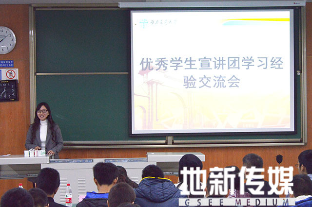 随后由2013级环境三班的吉马衣子分享自己的四六级学习经验和考试技巧。首先吉马衣子分析了四级考试中的各类试题,接着针对各种类型的题目分享了答题要点和自己的做题经验,并且针对各类题型传授了自己在英语学习中的一些实用的应试技巧。最后,吉马衣子再一次强调英语课程学习的重要性。