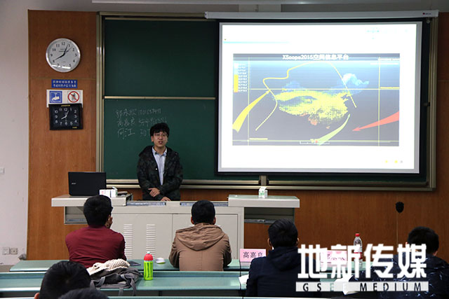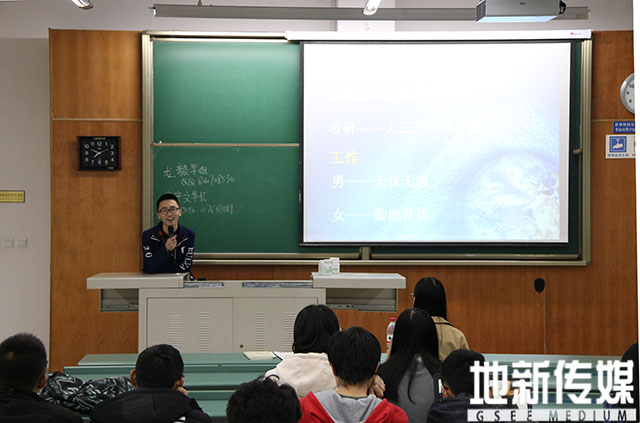 在X4156教室,首先是郭永欣学长向同学们介绍GIS的概念、地信专业所学基本课程,以及毕业后的就业方向。随后,郭永欣学长给同学们传授学习经验。郭永欣学长讲到,学习首先要培养兴趣,因为没有兴趣是学不好专业知识的,反之,浓厚的兴趣能提供源源不断的学习动力。另外,郭永欣学长强调,养成良好的生活规律也是很重要的,早睡能提高学习效率。之后是高嘉良学长上台分享经验。高嘉良学长首先展示了一个炫酷的关于天猫“双十一”的视频 ,并以此生动而形象向同学们讲述了地信专业毕业后能做什么。之后高嘉良学长说到了找工作的这个问题。高嘉良学长指出公司看的不是学历而是能力,能力的大小决定了你所能拿到工资的高低。高嘉良学长提到了在就业上,各公司对地信专业毕业生的需求很大,所以地信专业的发展前景很好。最后高嘉良学长谈到了地信专业给自己带来三个东西:软件开发、地理学和数学。