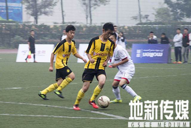 在主持人介绍了双方的首发阵容后,比赛正式开始。此次比赛两方队员均采用3-2-1阵型。随着裁判的一声哨响,两支球队迅速进入比赛状态。黄队凭借巧妙的攻略,熟练的脚法,默契的配合,多次突破对方的防线,守方也不甘示弱,门将屡次飞扑将球拦下。其中,黄队前腰7号势如破竹,一个漂亮的回旋踢赢得了在场同学的欢呼声。比赛进行的如火如荼,在黄队快要进球瞬间,白队一个侧踢成功阻拦进球,双方僵持不下。40分钟后,上半场比赛结束,两队均未得一分。次轮比赛,纵然黄队屡占先锋,然而白队守门员以敏锐的判断力死守球门。休息10分钟后,下场比赛开始,两队均未换球员。比赛7分钟后,黄队11号罚球获得整场比赛第一分,场下观众席激情澎湃,为队员们呐喊助威。足球比赛,受伤在所难免,白队21号踢出的球正对黄队5号胸口,然而他并未申请离场,仍旧坚守在自己的位置上。5点42分,白队10号突破重重阻碍,在队友们的短传下成功将球踢进网内,为白队取得一分,此后白队士气大增。比赛继续进行,此时双方队员体力透支,筋疲力竭,部分队员多次摔倒在绿草坪上,却还是咬紧牙关继续站起。随着下半场比赛结束,备受期待的点球大战一触即发。黄队1号、6号、12号、9号皆成功进球,白队21号、13号为本队夺得两分。最终,黄队凭借点球中的优异表现,领先白队2分获得胜利。