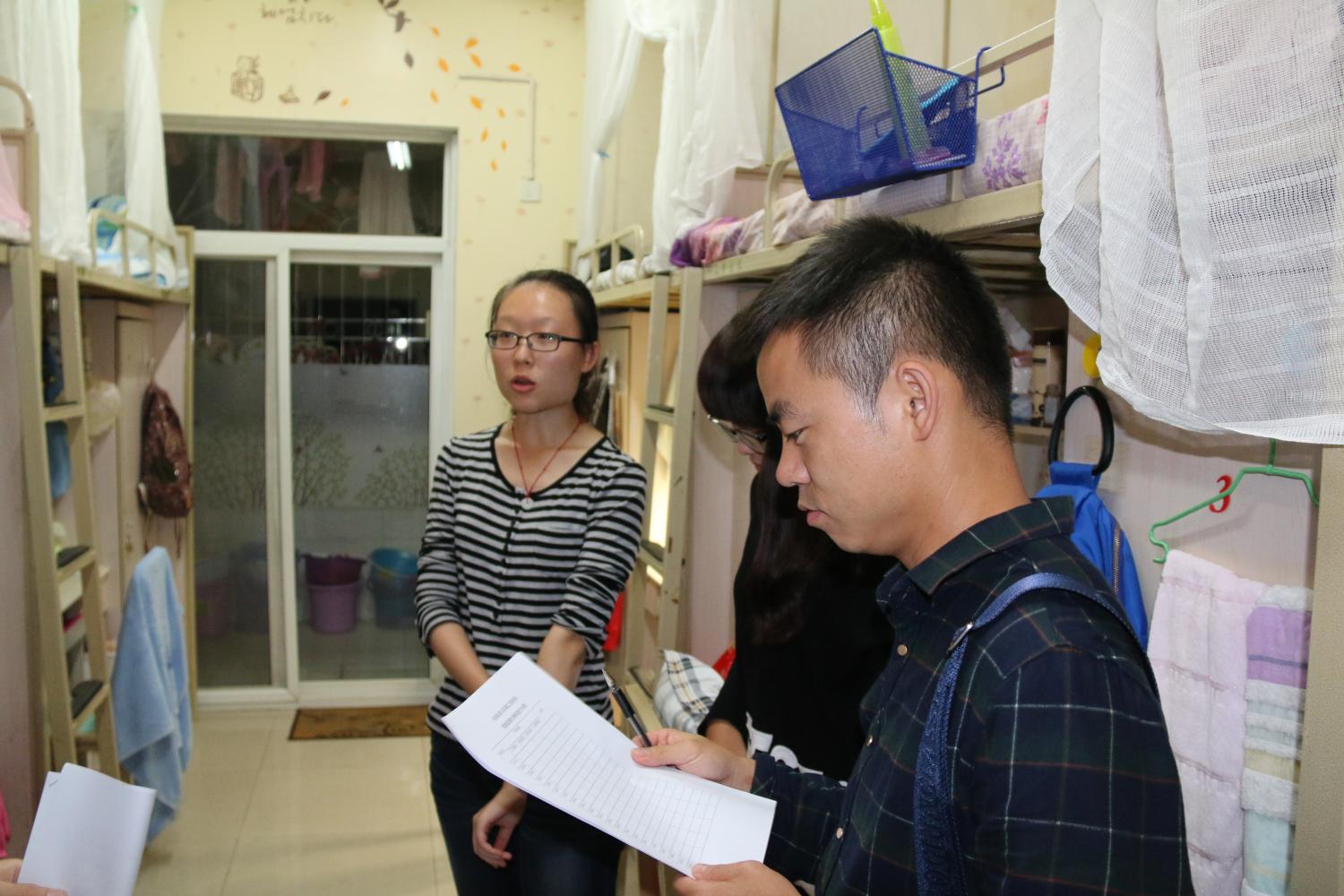 学生会举办了新生寝室装潢大赛。10月16日晚,在寝室装潢大赛海选结束后,我院新生辅导员孙彦文老师带领地学学生会主席团对脱颖而出的学生寝室进行第二次筛选,对进入初选的二十个寝室进行了打分评比。