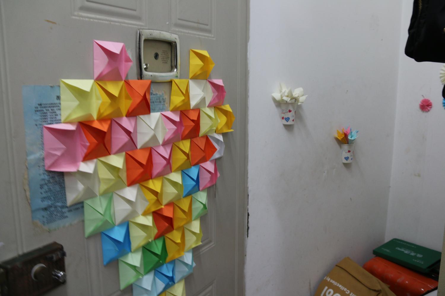 寝室作为学生们四年的家,我们的大一新生将寝室布置的爱意满满。而男生女生们各有千秋,女生将自己的心灵手巧运用到寝室布置之中。像202009中用手工制作的纸花妆点寝室,天花板上贴上荧光的星星月亮来仰望成都的“夜空”。在202020的女生寝室中,在暖色调里感到自然悠闲。而在男生寝室更有意想不到的收获,有国防主题寝室对于热血青春的追求、有书香文化寝室对自己大学学习生活的鼓励、还有励志寝室对日后破茧成蝶的希望……有藏语的可爱门牌号,还有锦上添花的萨克斯表演《天空之城》…让我们惊喜的有更多,但更让我们感到的是他们的青春活力和像家一样的温馨氛围。