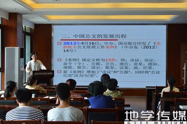 课程伊始,刘占祥从自身办公室的经历切入。“办事、办文”是他对办公室工作的通俗概括,他还对日常工作服务九个要点进行了形象地总结,并分享了几个工作中的趣事,诙谐幽默的言语使得课堂的氛围少了一分拘谨与严肃,多了一分活泼与风趣。随后,刘占祥教授又结合几个具体的公文用词用句的修改例子,从公文结构、表达、语言等多个方面,讲解了公文写作的要求。