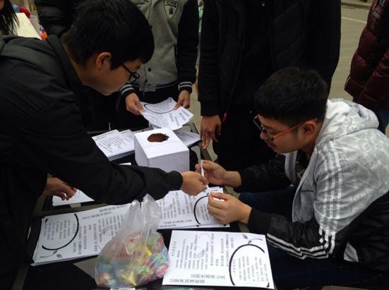 活动开始前,团支书将具体工作分配到各个同学手上,每位同学也都尽力做好自己的工作。十二时,活动正式开始,同学们被分为五组,其中两组同学在来往的人群中发传单,其余同学则坚守大本营,为到来的同学努力讲解并组织其有奖答题。到来的同学首先从箱子里抽取问题,回答正确的则得到小礼品,然后,再在横幅上签字。