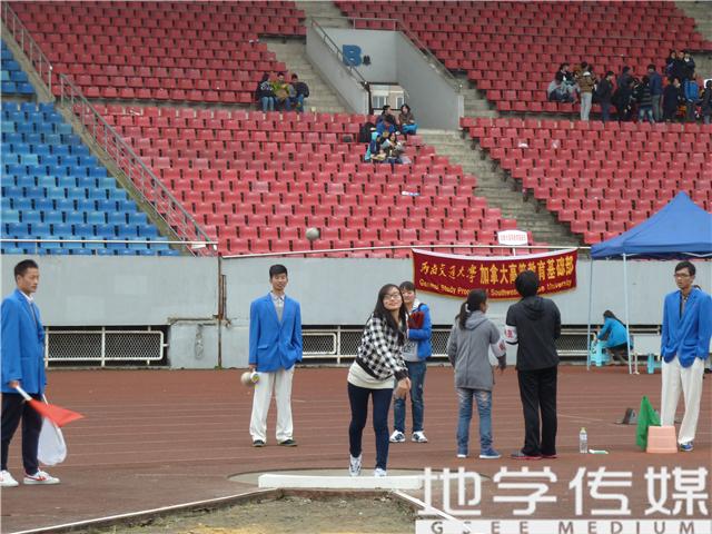 在投掷过程中,同学们都使尽全力,将铅球抛至远处。每一次激动人心的一掷,每一条优美的空中曲线,都引来观众阵阵欢呼。随着赛场上记录分数的小旗越插越远,同学们的欢呼声也越来越高,第三轮掷球,几乎每一球落下,都能刷新选手自己上一次的成绩。最终由来自峨眉校区的李奕冉、张梦乡和来自电气学院的陶孟兴分别以8.76米,8.57米,7.99米的成绩获得冠亚季军。