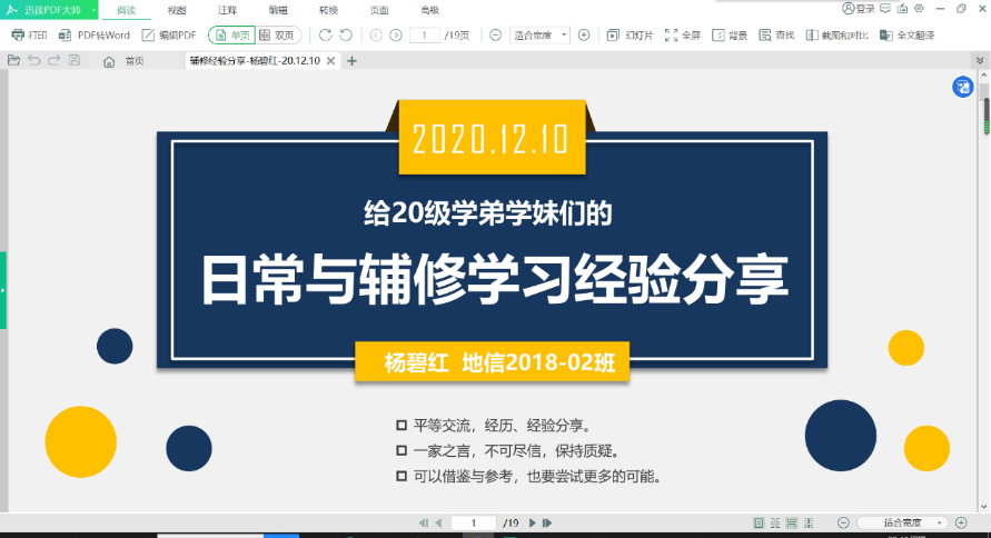 第二位是杨碧红同学,她进行了关于辅修课程方面的经验分享,她也从四个方面进行了介绍,分别为个人介绍、日常学习、辅修介绍、辅修带来的收益。其中就后两个部分进行了相对详尽的介绍,一方面讲述了辅修本身的一些特点,另一方面提到了很多自己以及其他进行辅修课程同学的感受,准备的十分充分,讲解的幽默风趣。在问答环节,同学们积极踊跃的提出问题,杨碧红同学一一应答,使分享会互动性十足。