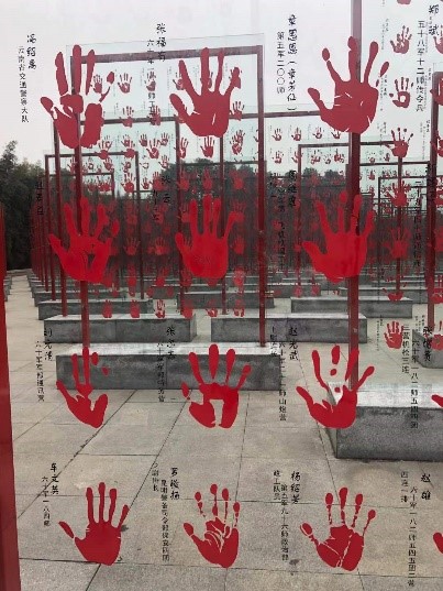 2月26日,踏入建川博物馆,我们便深深地被中华儿女和中华民族的伟大所震撼。在建川博物馆老兵手印碑林上(见图1),一个个鲜红的手印诉说着那段峥嵘岁月。它们的主人是曾参加过抗战的老兵们,他们之中年龄最大的九十九岁,最小的也已有八十岁高龄。我们永远无法留住生命,却可以将这些手印永远留下来,让它们来告诉后人抗战的艰难以及和平生活的来之不易,让这些曾握过大刀、长矛、投掷过地雷的手能在这世间留下印记,这样即便百年千年,只要有人记得,这些革命先辈就依然活着。