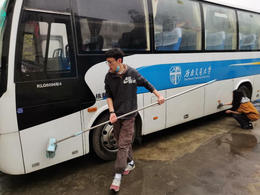 地学青协志愿者共十六人利用周末的空闲时间,带上清洁工具在北区校车站集合,乘坐校车来到九里校区的校车停靠区提供了清洗校车的志愿服务。