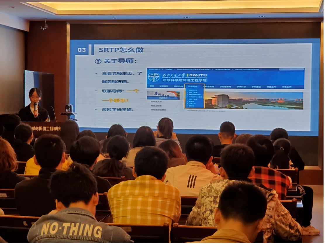 班级联合会举办,20 18级环境工程专业优秀学生崔耀丹作为主讲人,为同学们开展“SRTP经验交流分享会”讲座。2018级至2020级各专业学生参加本次讲座。