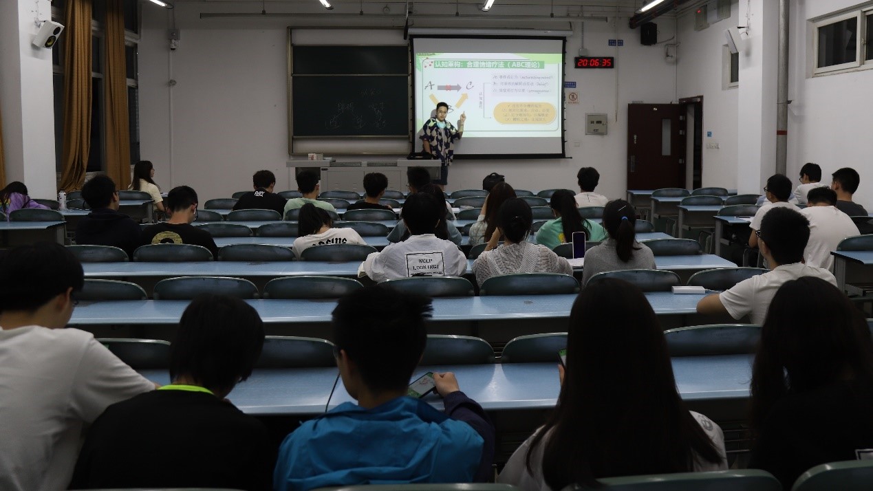 讲座伊始,张书宇通过一个压力小测试引出了压力的概念,进而阐述了产生压力的三个关键要素及压力源等概念;并就大学生中常见的几类挫折进行了举例分析,现场引导同学们参与耐挫力小测试,帮助大家清晰认识压力,合理解压。张书宇指出大学生的压力来源于多方面,或多或少影响着每个人的心理健康,可以从心理、生理和社会三个方面进行合理情绪疗法,以正面、积极的思想代替不合理信念,必要时寻求专业心理人员的帮助。