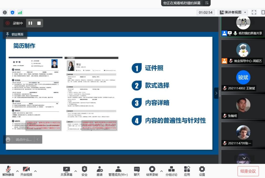 然后,学长谈到如何让心仪的单位选择你。学长从简历制作和面试等方面,分享了许多实用的小技巧。比如在简历制作时应该简洁大方,他还向同学们讲述了在面试时应该注意的细节,争取给面试官留下一个好印象。