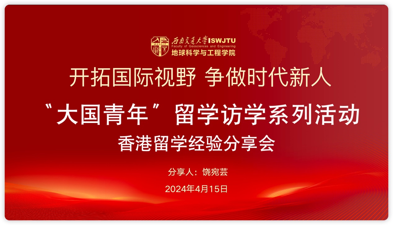 2025年4月15号8点,“大国青年”留学访学系列活动香港留学经验分享会以线上会议的形式展开。本次活动的主讲人为饶宛芸,是SWJTU-OSU安全工程专业2019级学生,2023年就读于香港科技大学环境工程硕士专业,曾在重庆日报/武侯区国有资本投资集团项目管理部实习,获得过绿色建筑从业人员证书 - BEAM Professional Certificate,担任联合国社会影响投资基金会UN-SGDs青年影响大使,现为香港数码港某海水淡化公司项目经理。