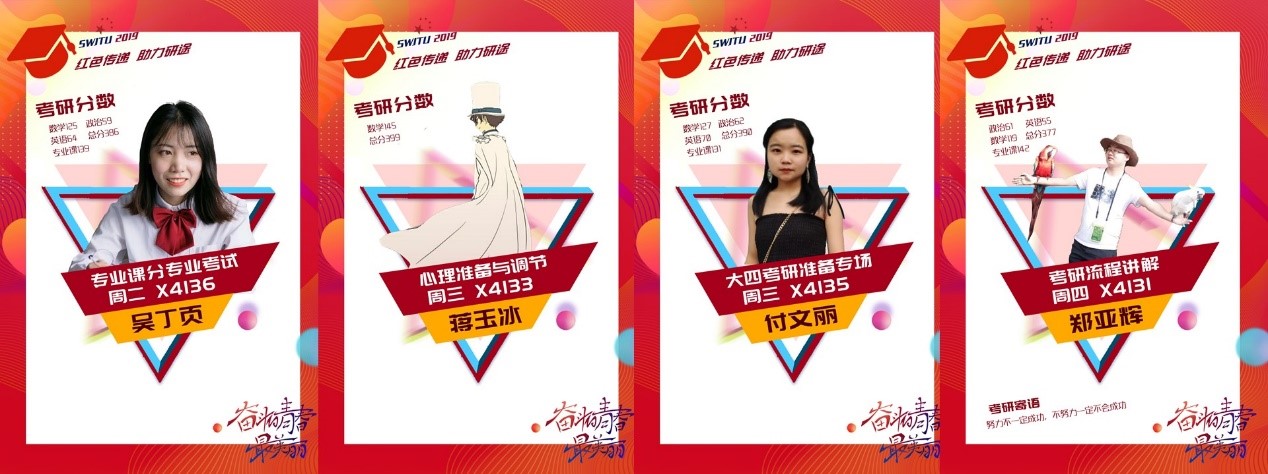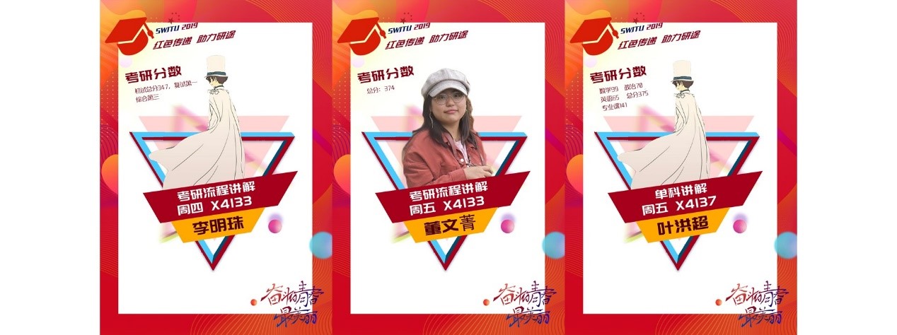 附:(1)周三晚安排有大四考研准备专场,针对大四考研学生开设,侧重于对于大四问题答疑,将由研一付文丽学姐为同学们讲解。欢迎准备考研及意愿考研同学参加。