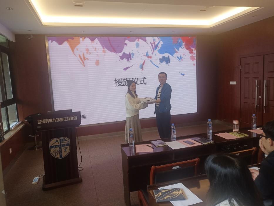 傅书记为俱乐部顾问谢玮同学授旗,并为领航生代表授徽