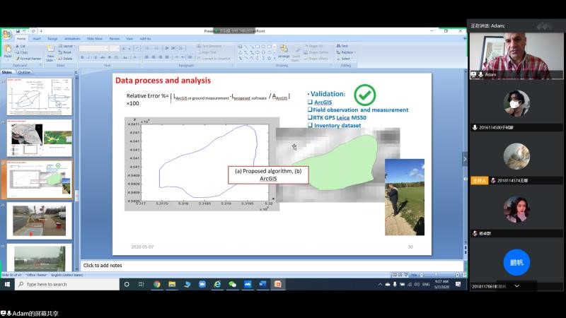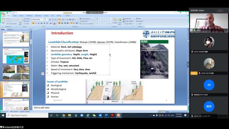 2020年5月7日晚20:00,地球科学与环境工程学院邀请学院外籍教师开展“国际化+名师讲堂”国际视野与出国留学系列第三期讲座,本次讲座通过线上平台“腾讯会议”进行,主讲人为Saeid(Adam) Pirasteh教授,讲座由杨都强老师主持,讲座主题为Research Colloquium in Geospatial Information Management for Disaster Management: Landslide(地理空间信息管理促进灾害管理研究讨论会:滑坡)。