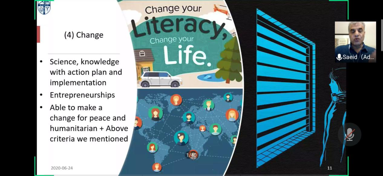 Saeid教授在杨老师讲话结束后开始直入本次讲座主题:Literacy,Empowering and Strengthening Your Future(精通文化,赋予能力并加强你的未来)。教授通过播放视屏介绍了Literacy对于个人未来发展的重要性,然后结合个人经历再次予以强调。然后,教授从多个方面开始讲解,先从两句格言:Knowledge is power. Knowledge turns oden heart to juvenile.(知识就是力量,知识将使人更富有活力)讲起,又以漫画和视屏的方式着重介绍Literacy重要的原因。