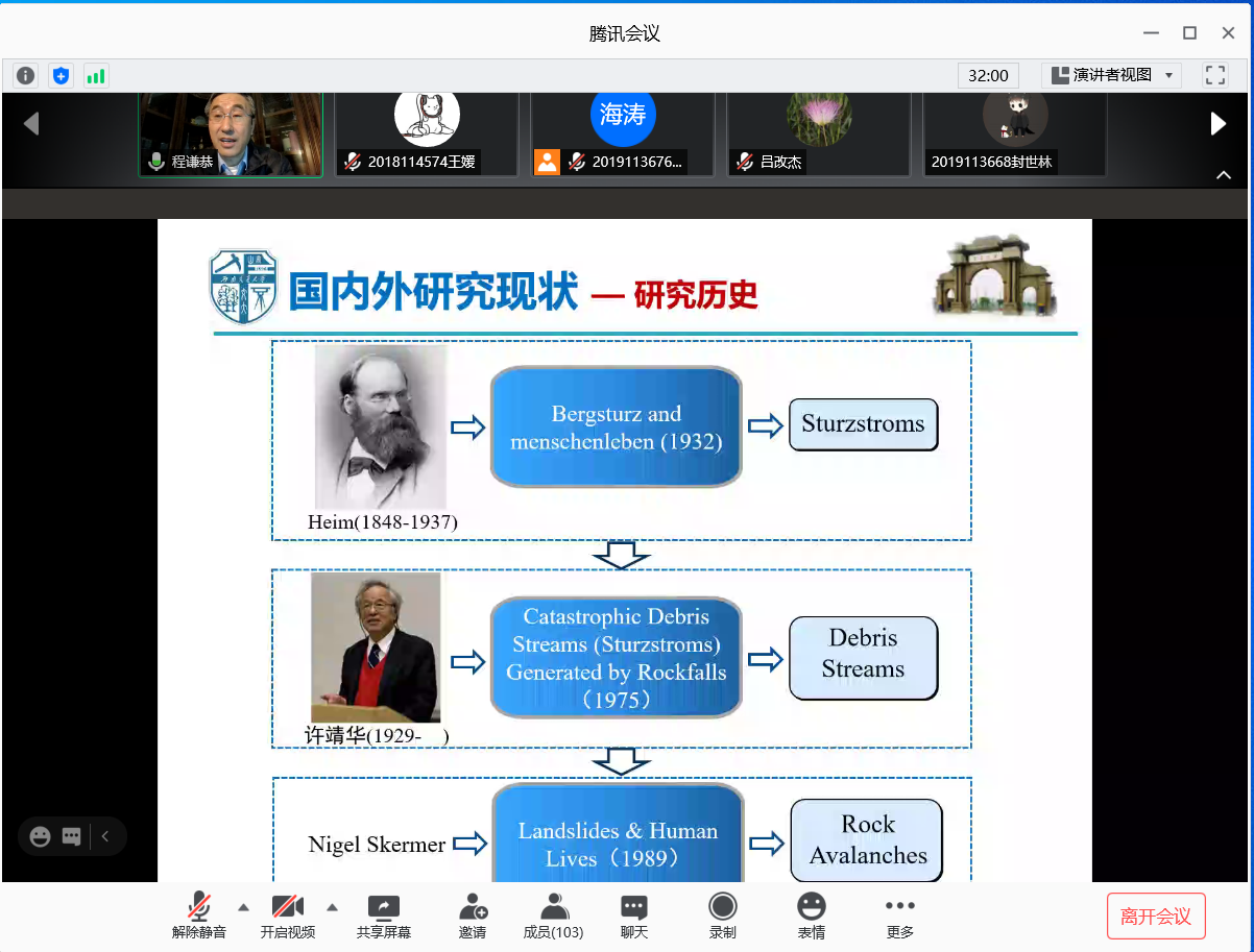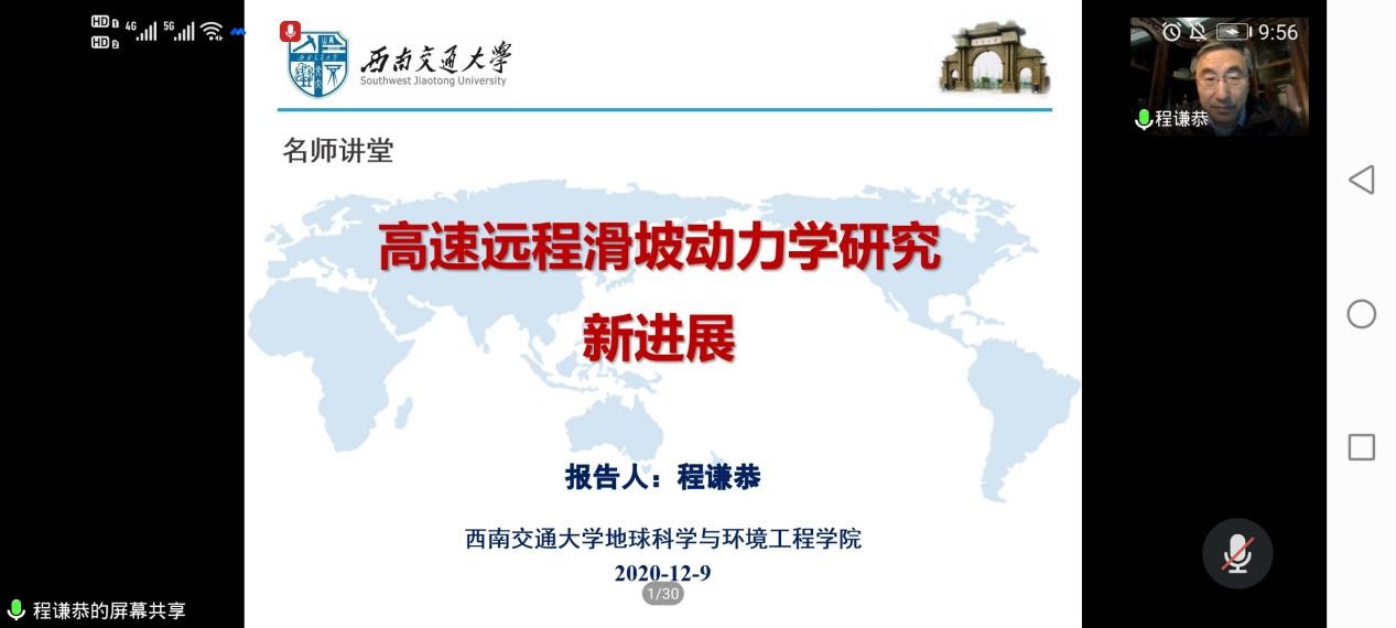 其次,程教授介绍了青藏高原地质灾害特征,对川藏铁路沿线的地质问题进行了一定的讲解、拓展。最后,程教授向同学们介绍了自己的团队研究进展,主要有以下四个方面:1.青藏高原高速远程滑坡摇感普查与分析;2.高速远程滑坡详查与工程地质特性研究;3.高速远程滑坡动力学机理研究;4.复杂重大滑坡关键技术研究。