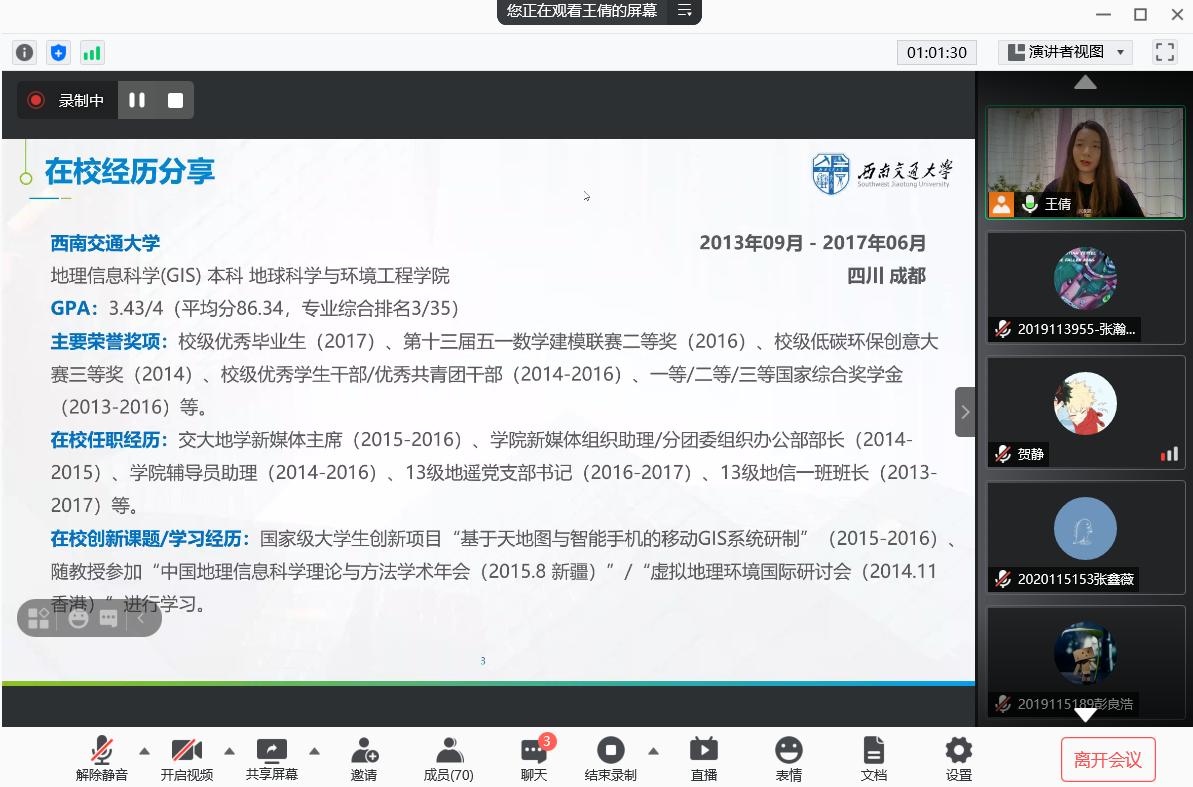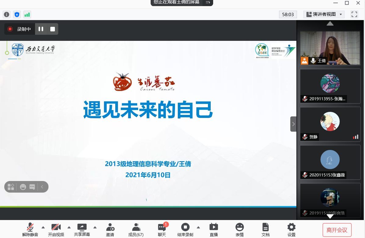 2021年6月10日晚19:30,地球科学与环境工程学院邀请学院优秀毕业生开展“生涯番茄”就业指导系列第三期沙龙,本次活动通过线上平台“腾讯会议”进行,主讲人为我校2013级地理信息科学专业毕业生,现就职于中移系统集成有限公司的王倩学姐。活动主题为“遇见未来的自己”。