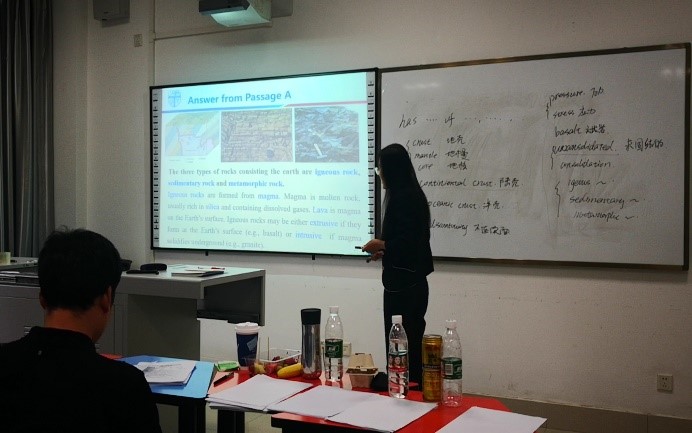 王玉峰老师主讲《专业外语(地质)》,她以教材Unit 2 The Earth的内容为主,从工程地质的角度出发,详细讲解了地球单元划分、岩性组成等相关英文知识。评委老师评价到所讲内容能够结合学生已有知识储备,有助于学生对于新知识的学习与掌握,思路较好,不过教材内容和课程设计上尚需进一步改进。