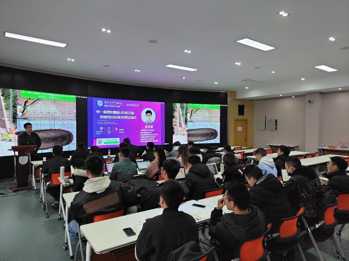 环境地球科学研究对象及研究领域具有很强的学科交叉性,为了促进学科蓬勃发展,打破不同领域技术和方法的界限,实现交叉学科理论融合与创新,2021年12月24日,我校地球科学与环境工程学院程谦恭教授邀请颗粒流、流体力学、计算流体力学、应用数学领域杰出青年学者,大连海事大学兴海教授、欧盟玛丽居里学者、德国达姆施塔特工业大学博士、英国曼彻斯特大学博士后、新加坡国立大学博士后及奥地利地质灾害中心研究助理孟宪南教授于我校X4243会议室开展了题为《单一粒径的颗粒-水混合物斜坡流动实验及理论研究》的学术报告。现场气氛热烈,学术氛围浓厚。