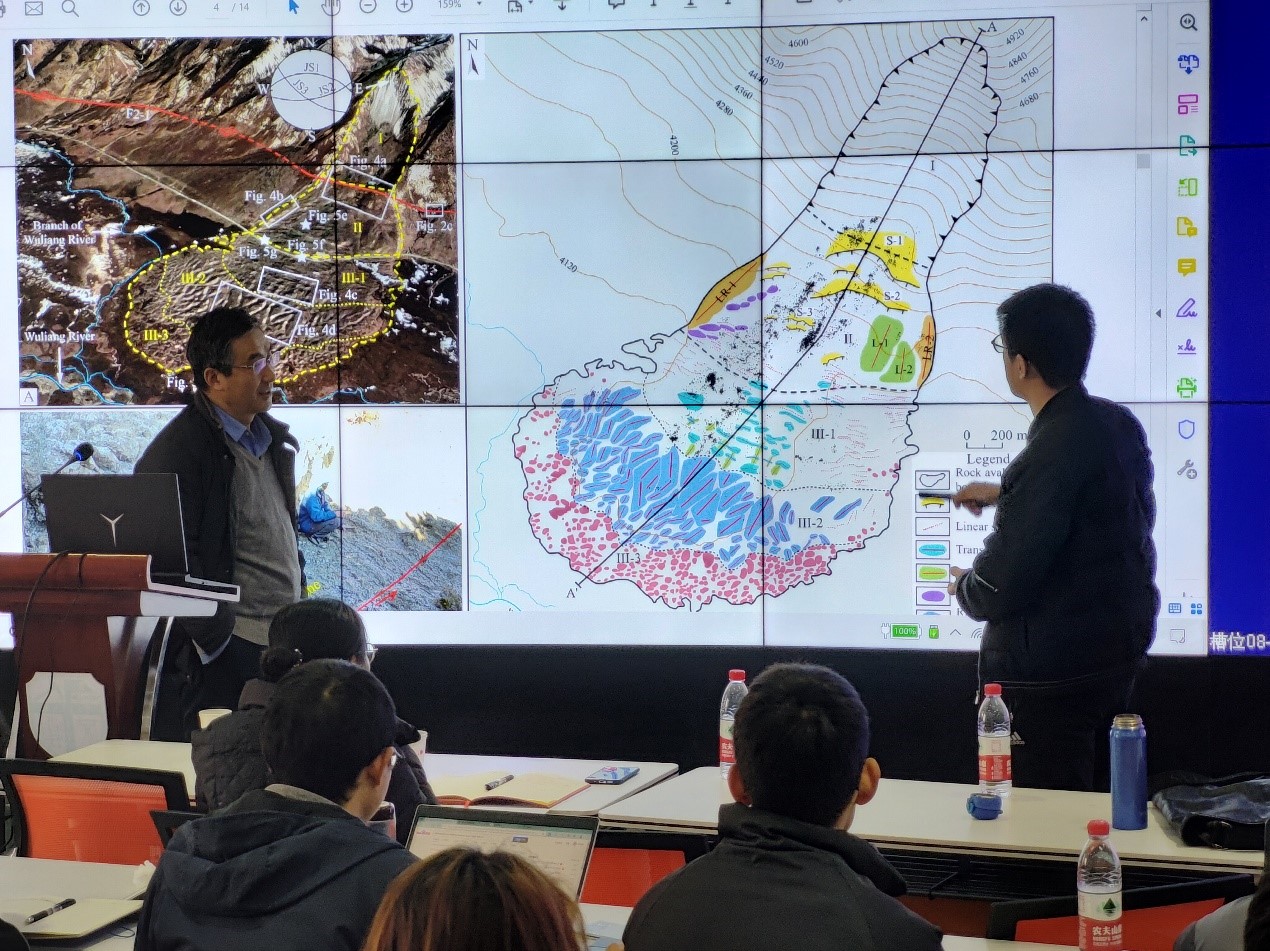 随后,孟宪南教授同参会人员就自然界和室内水槽实验中均被观测到的“Roll wave”现象及其形成机制、数学-力学模型推演等方面展开了热烈探讨,并结合高速远程滑坡典型堆积地貌中展现的横向脊、纵向脊、边缘堤、侧向脊、雁列形裂隙状脊以及沟脊相间的X型(鱼鳞状)堆积等流态化特征,从跨越领域和学科的视角分析讨论了上述地球科学领域典型现象及前沿科学问题的研究思路,为高速远程滑坡动力学机理相关研究提供了启发性思想。