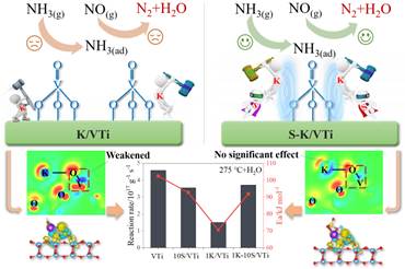 V2O5/TiO2(VTi)催化剂是目前应用最为广泛的固定源氨选择性催化还原(NH3-SCR)脱硝催化剂。在实际应用过程中,烟气中的酸性物质SO2(S)和碱金属(K)都可导致催化剂中毒失活。本文系统地探究了S和K在VTi催化剂NH3-SCR反应过程中的协同作用。研究结果显示,VTi催化剂的耐S中毒能力较强,耐K中毒能力较弱。当S和K同时存在时,S和K之间的协同作用反而会产生一种解毒效应,即当VTi催化剂表面同时存在S和K时,其活性可恢复到接近未中毒VTi催化剂的水平。XPS和电荷密度差分研究均表明,K的引入可以显著影响活性位点V的电子结构。但当进一步引入S时,S和K之间可发生强电子交互作用,削弱K对活性位点V电子结构的影响,使得催化剂活性得到一定的恢复。此外,这一解毒作用也可发生在其他碱金属(例如Ca和Na)和S之间。因此,这种解毒效应存在于实际的反应气氛中,可缓解工业V2O5/TiO2催化剂的碱金属中毒作用。