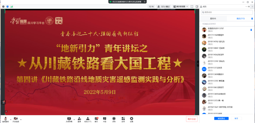 在讲座的最后,王晓文对本期内容进行了总结和展望,提出了未来将基于空天地一体化技术手段监测川藏铁路的空间形态及形变,同时鼓励地学青年学生也参与到我国遥感科学的工作当中,勇于创新,学习先进的科学技术,投身于我国的铁路建设当中,用青春的热血去建设我们美丽的国家。