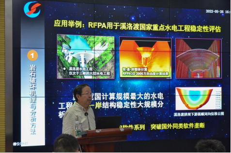 在报告中,唐春安教授首先围绕岩石破坏机理与分析方法,指出岩石力学特性的复杂性、岩体结构特性的复杂性与岩体工程环境的复杂性,加之传统模型实验研究的局限性,是目前岩石破坏问题研究面临的挑战。而数值模拟可使研究的效率与准确度大幅提升。在传统数值模拟方法的基础上,唐春安教授团队创造性地聚焦连续介质力学方法与非连续介质力学方法中的过渡段,即基于连续介质力学方法,模拟非连续介质,自主研发了基于细观损伤元的RFPA(Rock Failure Process Analysis)数值模拟软件,以实现岩石从变形至破裂的过程模拟分析。唐春安教授概括了基于RFPA数值分析方法的特点:其一,该法将复杂的非连续介质断裂问题,通过数学连续、物理非连续概念,转化为简单损伤力学问题,规避了复杂的求解过程;其二,该法通过将研究对象划分为有限个足够小的单元,将宏观的岩石材料非均匀性,转化为细微观的均匀材料问题,规避了材料非线性变形问题;其三,该法可与适用于大位移分析的DDA(Discontinuous Deformation Analysis,非连续变形分析法)相耦合,以实现对岩石变形-破裂-运动的全过程模拟分析。随后,唐春安教授分享了他研究岩石变形-破裂问题多年来,对于岩石材料的弹脆性与非均匀性本质、岩石破裂的力学机制、简化(Simplify)与简单(Simplicity)科学问题的异同点,及以数值模拟方法研究岩石破裂前景的感想。
