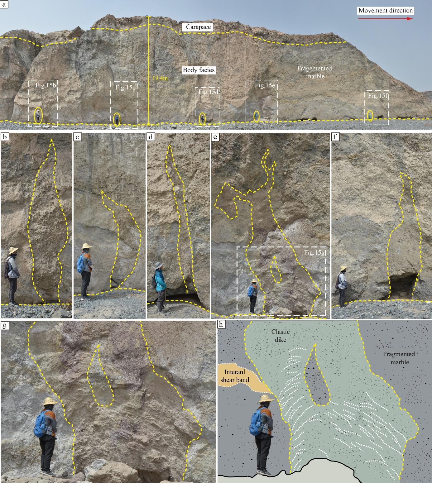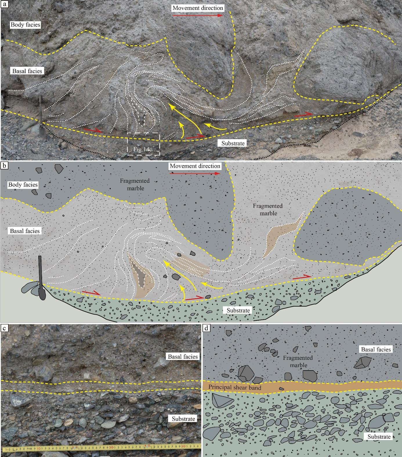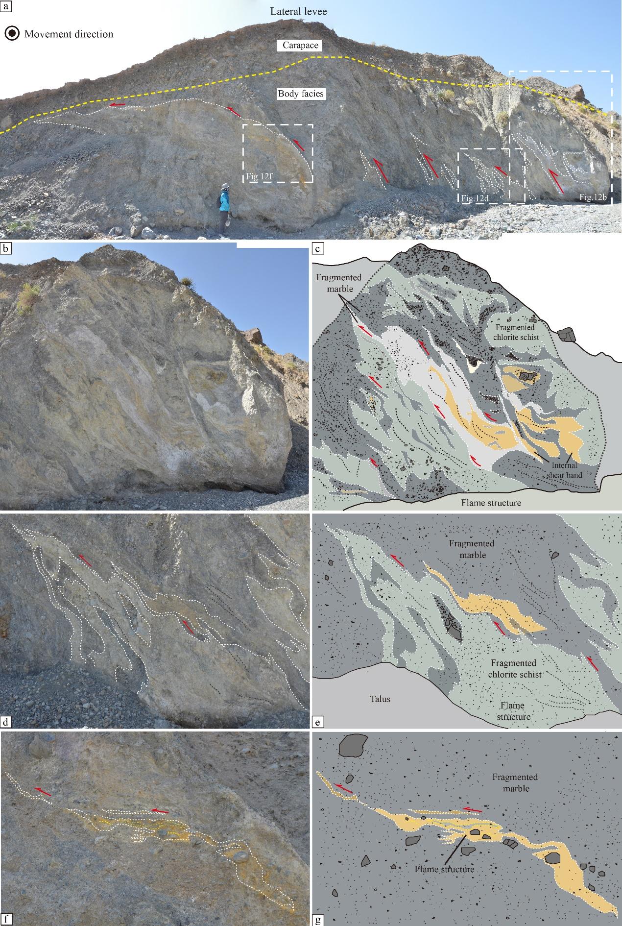 (3)国内外首次在高速远程滑坡侧缘堤中发现了由内向外翻卷的火焰状结构(图3)。这表明,在滑坡运动过程中,后部的滑体物质不断推挤并犁铲前部减速的滑体,导致前部滑体向外翻卷并形成火焰状的剪切带。这一发现揭示了高速远程滑坡侧缘堤的形成机制与滑体物质的侧向推挤运动有关,而非一些国际流体力学研究文献所报道的颗粒分选机制。