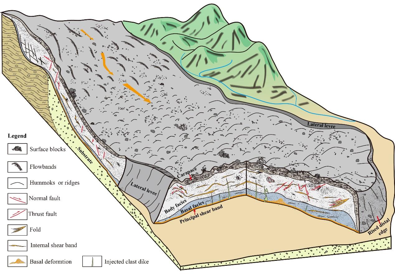 程谦恭教授科研团队对帕米尔高原的高速远程滑坡进行了持续的调查研究。近期,团队成员史安文博士研究生、王玉峰特聘研究员等通过野外深入细致地调查研究,揭示了帕米尔高原东缘依买克(Iymek)滑坡(图1)的地质特征。通过遥感影像、地质调查、统计分析等研究手段,分析了依买克滑坡的孕灾地质背景和源区基岩物质组成,确定了依买克滑坡的同震启动机制;通过对源区及堆积区初始地形的重建,确定了依买克滑坡是中国大陆目前已知最大规模的高速远程滑坡;详细刻画了滑坡堆积体存在的各种堆积地貌与内部堆积结构,概化了依买克滑坡堆积模型(图2);在此基础上,对各种地貌单元与内部结构的形成机制进行深入分析,揭示了依买克滑坡路径相依的运动演化过程、滑坡-下伏层相互作用特征以及滑坡停积的动力学机制;并与全球不同地区高速远程滑坡实例进行对比分析,揭示了下伏层特性对高速远程滑坡堆积地貌与堆积结构的重要控制作用。主要的发现和认识如下: