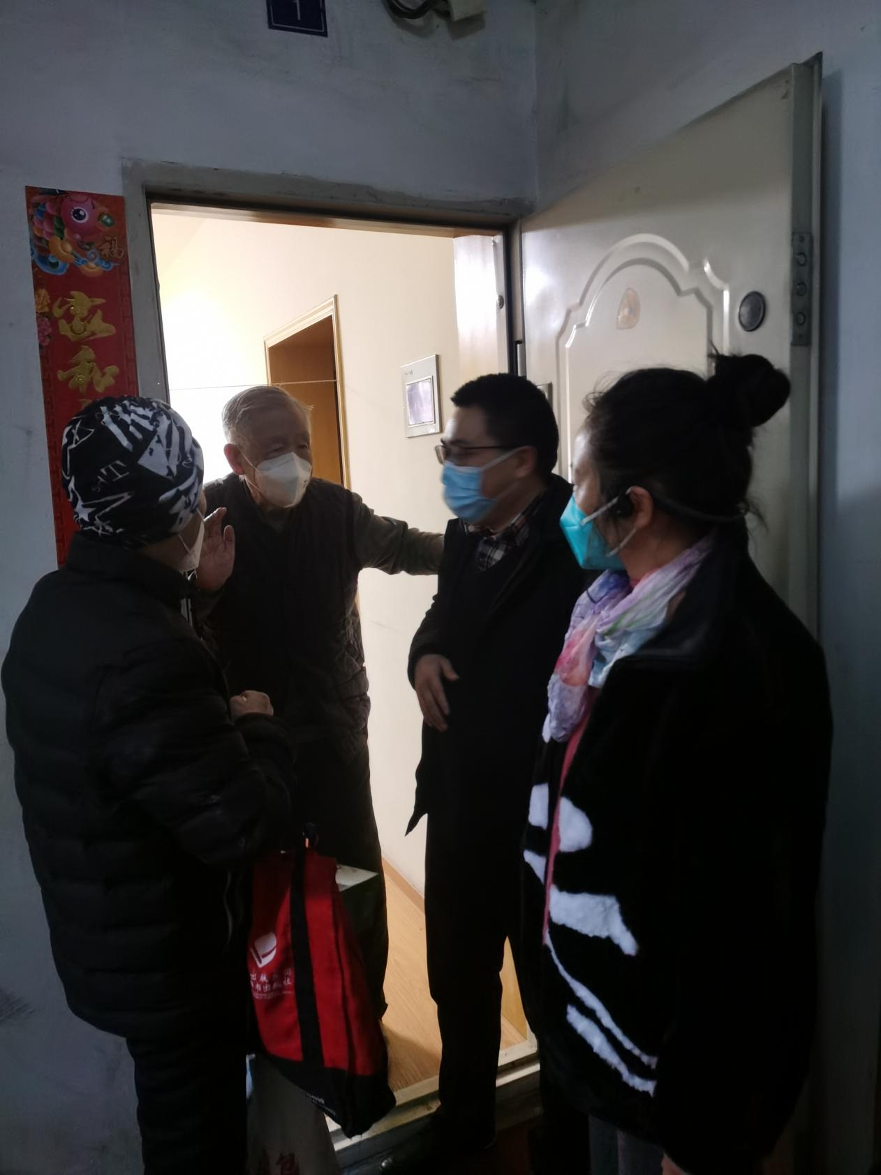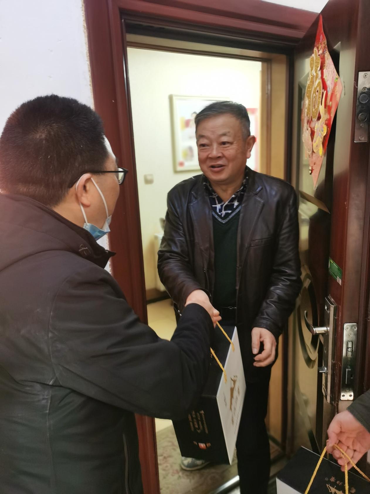 慰问的前一天各系秘书先给老同志们打去了关心的电话,拉家常询问健康的同时,也了解清楚老同志们目前的居住地址。1月12日上午,慰问小组成员早早地就来到了学校居住区,为了老同志们的身体着想,减少聚集,由慰问小组登门为老同志送去祝福;对于部分不方便的老同志采取“零接触”式送祝福到门口,然后通过电话表达学院对老同志的关心关爱。