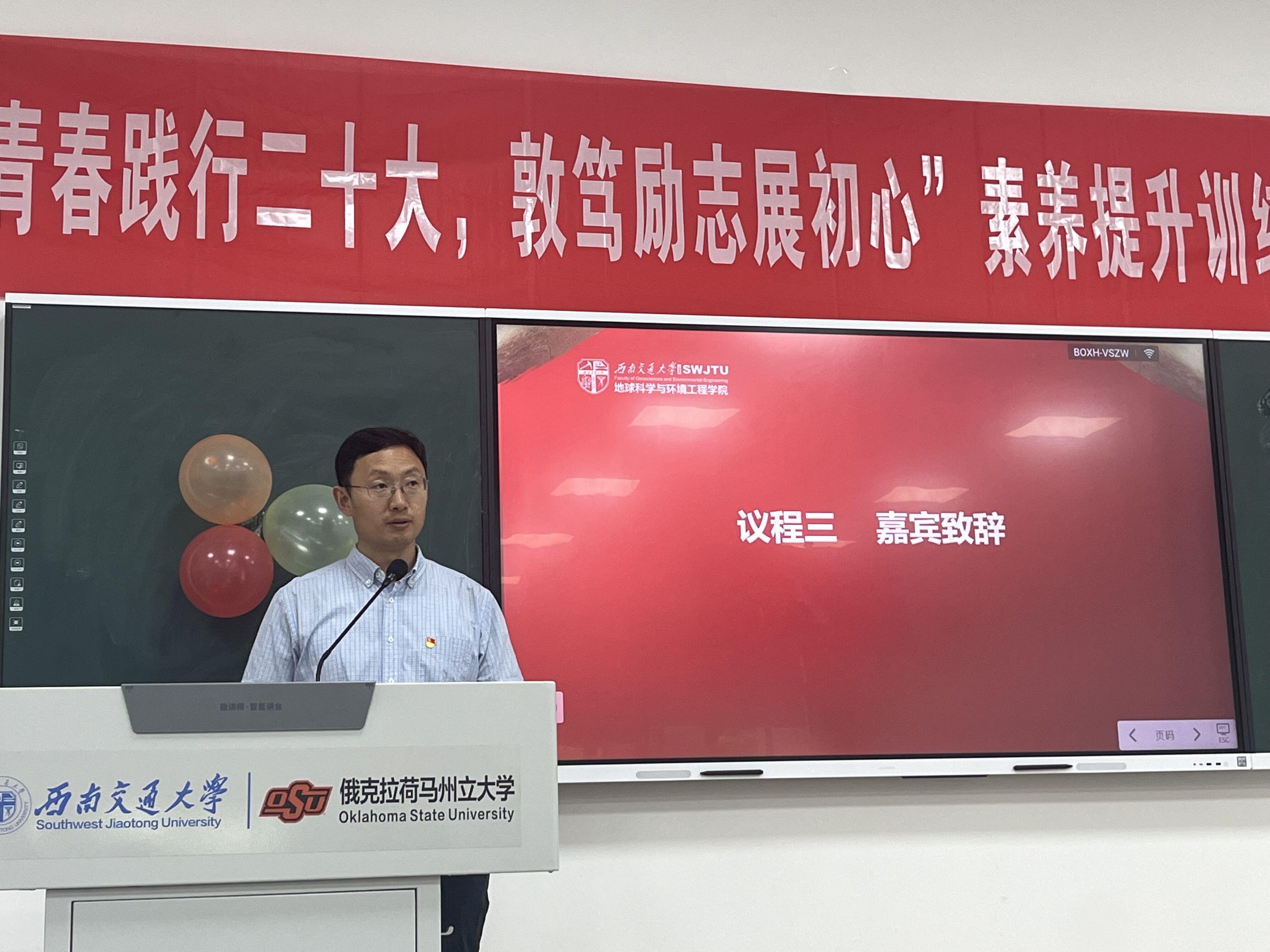 党委副书记、纪委书记郑波随后致辞,强调了大学生提升自身综合素养的重要性,一代人有一代人的使命,一代人有一代人的担当,作为青年大学生,应该有理想、有道德、有责任、有担当,并表达了对参营同学们的殷切期望和肯定。郑波强调训练营要从实际出发,将“扶困”与“扶智”相结合,落实“立德树人”根本任务,提升学生基本素养和能力,希望全体营员脚踏实地、仰望星空,并预祝素养提升训练营圆满成功。至此,本次“青春践行二十大,敦笃励志展出心”素养提升训练营开营仪式宣告结束。