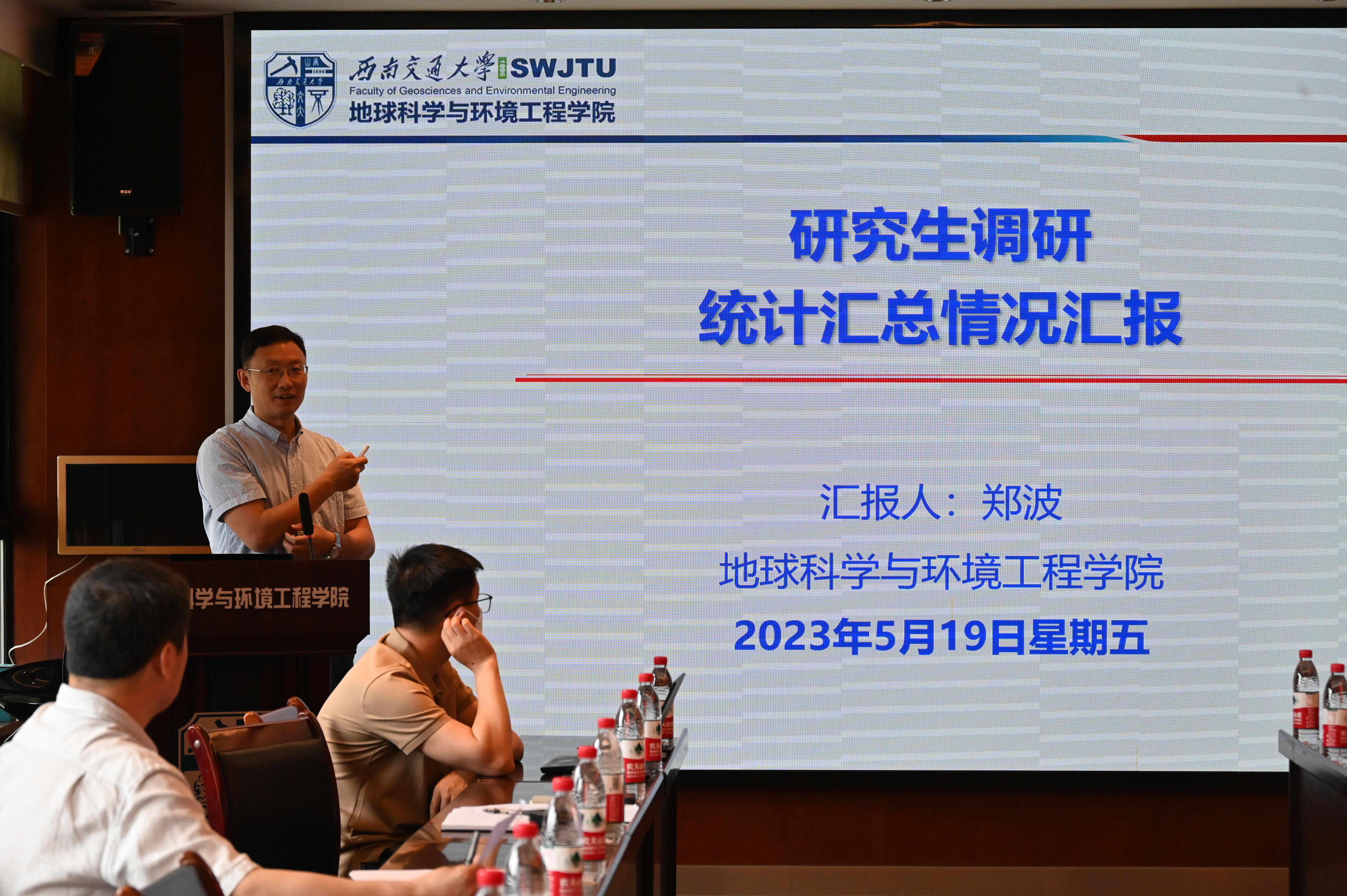 郑波就前期研究生调研情况进行汇报,从学习与科研、生活及人际关系、压力来源及解决途径等方面报告了调查问卷中反映的学院研究生有关情况,并分享了博士研究生座谈会上听取到的同学们的意见建议。