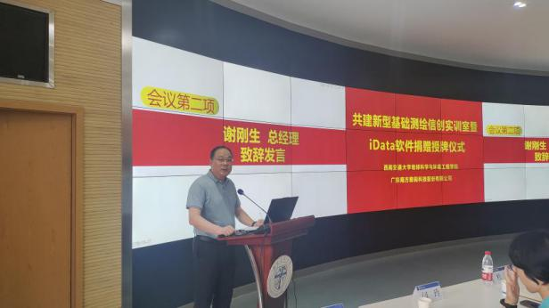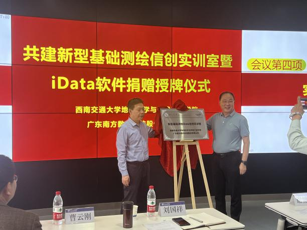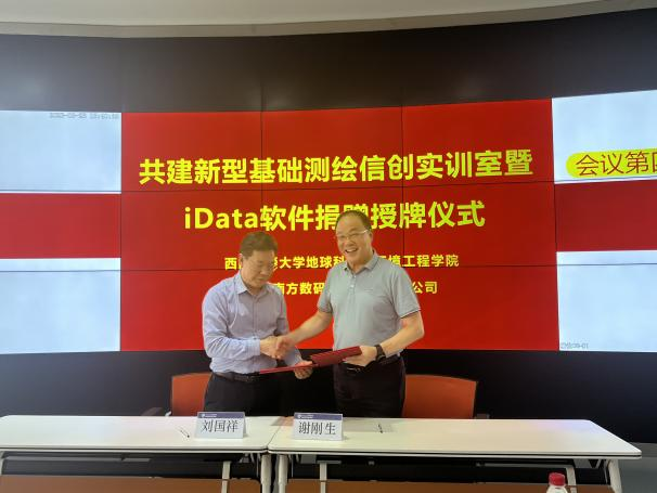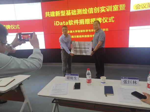 地球科学与环境工程学院刘国祥院长与南方数码集团总部谢刚生总经理为“新型基础测绘信创实训室”揭牌,并签署了校企合作协议。谢刚生总经理、测绘实验中心黄育龙主任进行了实验室授牌仪式,张巨林总监代表南方数码向测绘学科代表张同刚副主任捐赠了60个网络节点的“南方数码iDATA数据工厂”软件。